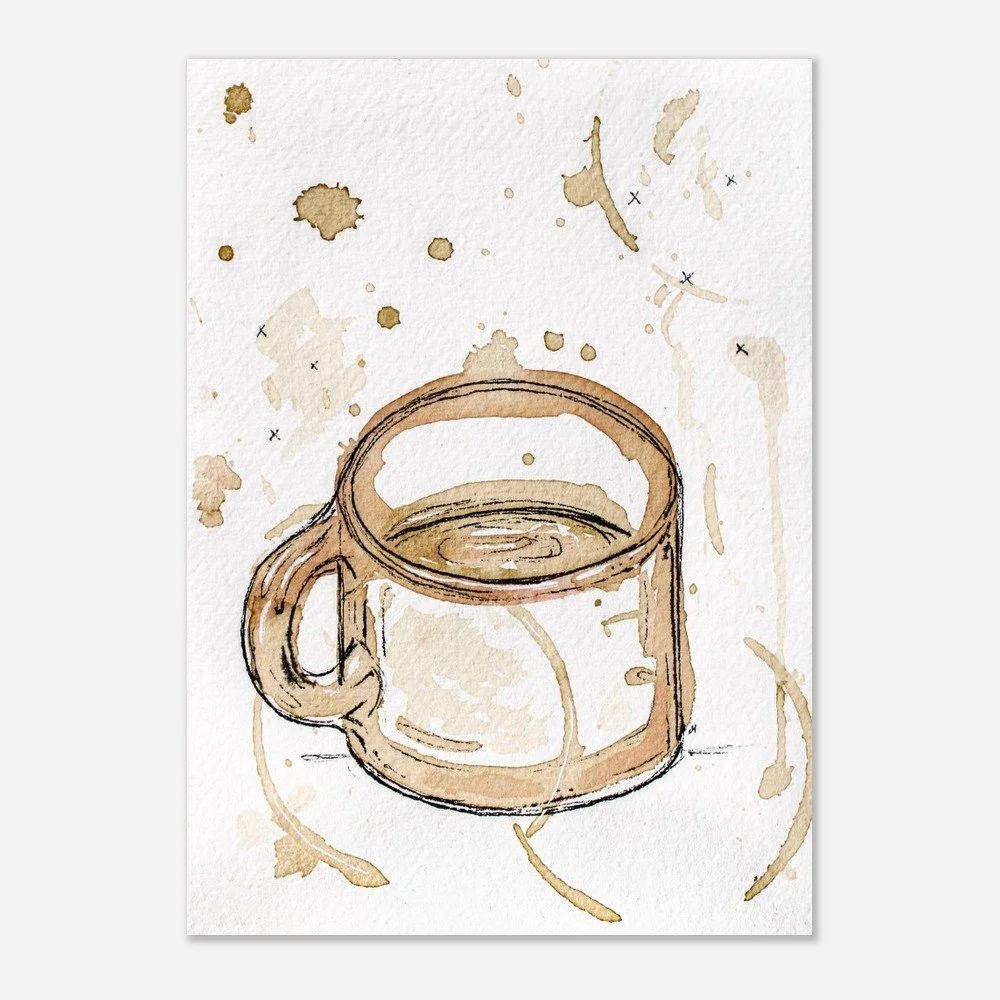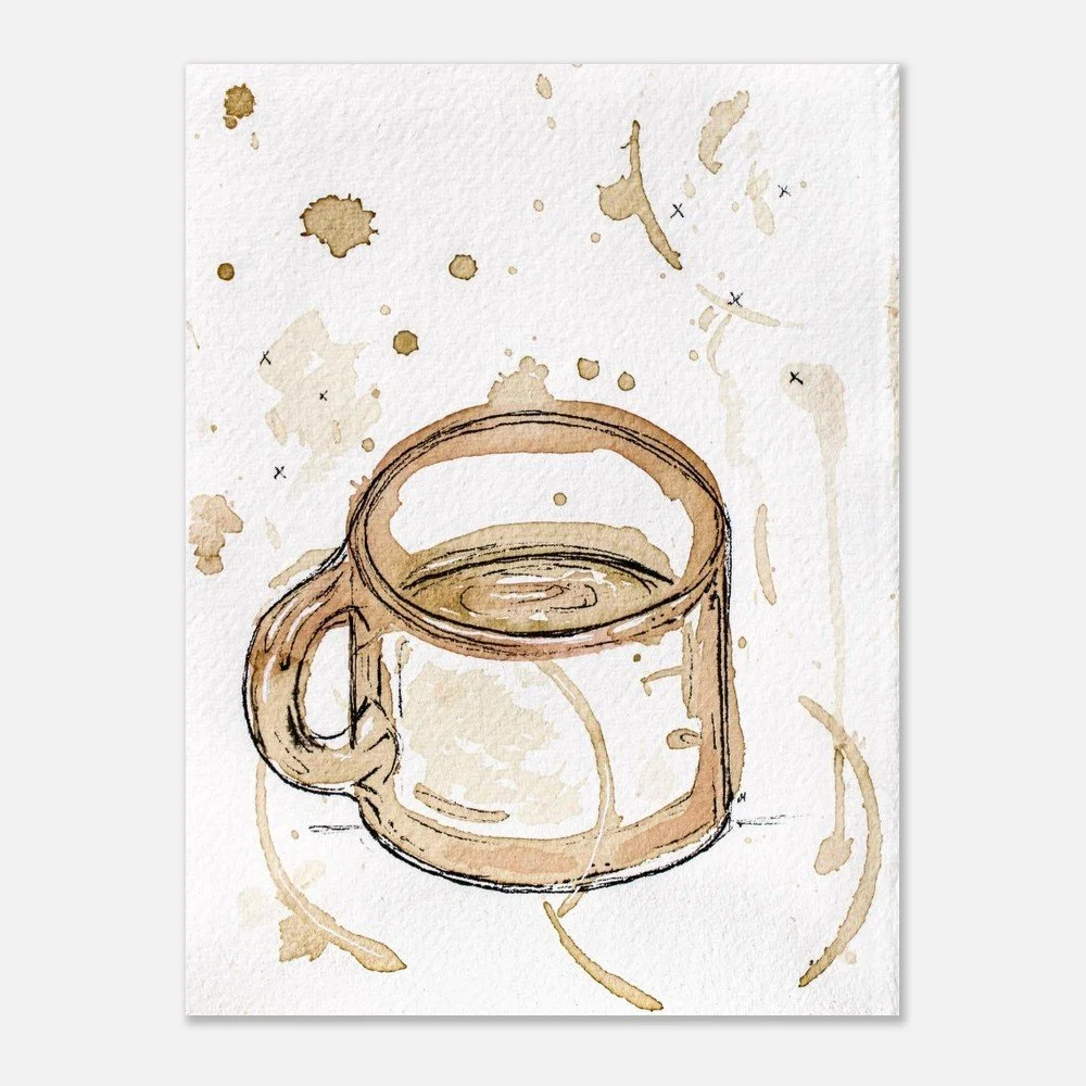 Created during my art residency in France, this piece was made one morning in the studio using only coffee from my mug—no paint. Coffee splatters and natural imprints from the base of the cup build the composition. Minimal hand-drawn line work adds some structure to the mug, while the organic texture of the paper is preserved in the print, allowing subtle details to come through. Ready to be framed in a style that fits your space!